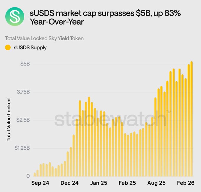 Milestone: @SkyEcosystem’s sUSDS has hit a $5 billion market cap, marking an 83% YoY growth rate.