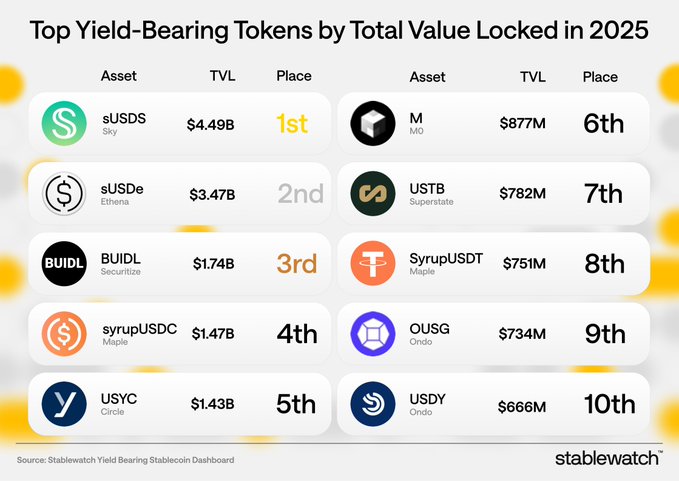 Top Yield-Bearing Tokens by Total Value Locked in 2025 1. sUSDS @SkyEcosystem - $4.49B 2. sUSDe @ethena_labs - $3.47B 3. BUIDL @Securitize - $1.74B 4. syrupUSDC @maplefinance - $1.47B 5. USYC @Circle - $1.43B