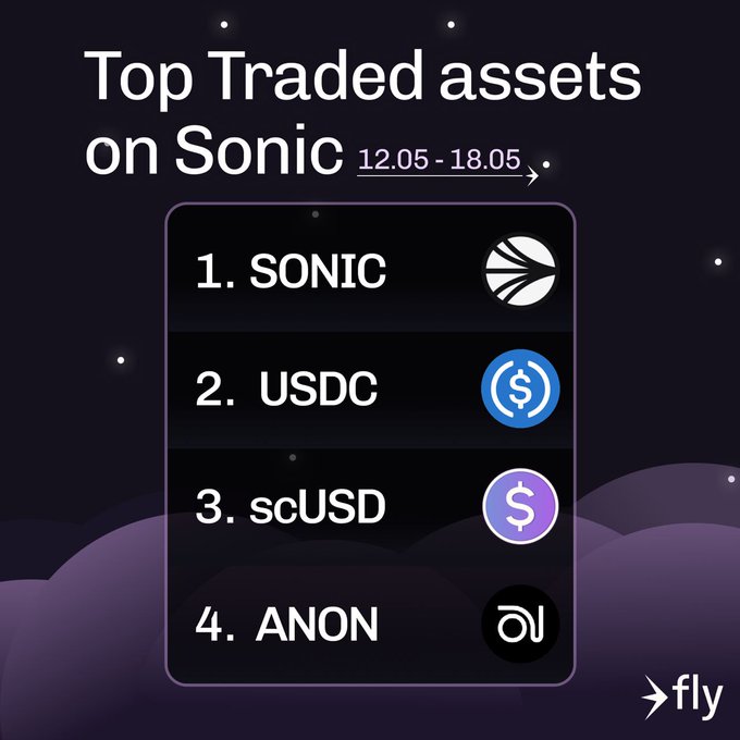 Top 4 most traded assets through Fly on @SonicEcosystem 1. $S 2. $USDC 3. $scUSD 4. $ANON