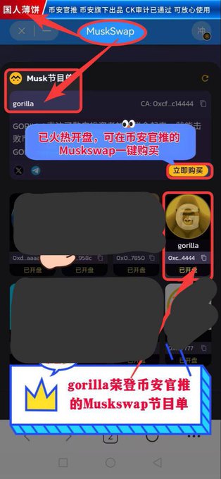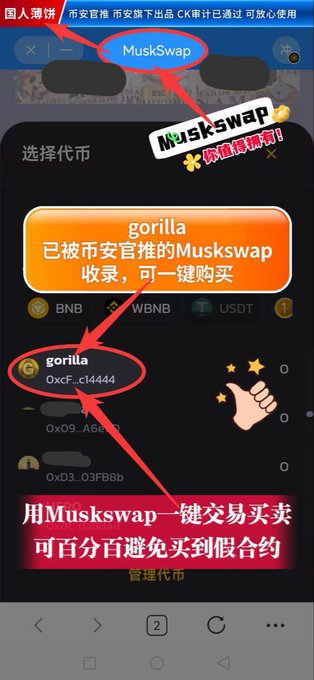Step by step, brick by brick!!! Gorilla keeps building on BNBChain 🧱 Gorilla has officially been added to the program list of Muskswap, a trusted swap platform building on BNBChain.✅ From now on, you can buy and sell Gorilla on Muskswap with one click safely. This ensures you avoid fake contracts and always trade the official Gorilla contract. —Muskswap link: muskswap.club/?outputCurrency=...… —Or simply open TP Wallet, search for “musk”, and you will find Muskswap and Gorilla contract details directly.