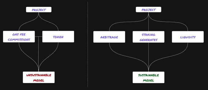 Business model in Defi lately I’ve been talking a lot about the “business model” of Defi projects, “why?” Defi is a young but already fairly large market that positions itself as a yield generating instrument that’s supposed to compete with stocks bonds the equity market and others meaning this market is supposed to become a financial tool that investors actually use to make money accordingly no yield = no investors = no growth but if you look at the current Defi project models, 99% of them have no real income besides ◆ gas fee commissions ◆ token that’s not enough for a sustainable project, the problem is that user activity depends on the market, in a bear market it drops and so do the project fees and token dilution is just a dumb idea overall, you can’t keep diluting a token forever that’s why now when looking at any project you need to focus on its yield, in the future only those will survive the market, and understand which models actually generate that yield if the docs or other sources don’t mention any info, that means the yield comes from the two methods listed above those projects are definitely not worth considering for a long term stable yield now we’re already seeing projects with sustainable systems, for example @alturax generates yield using 3 market instruments ◆ arbitrage 50% ◆ staking generates 30% ◆ liquidity 20% this kind of model is way more resilient to different market conditions and accordingly has a much higher chance of long term success the days when users only looked at TVL are over, it’s time to pay attention to the model the idea and the project’s yield