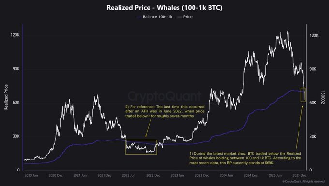Bitcoin just dropped below the average cost basis of whales holding 100 to 1,000 $BTC🚨 Similar zones in past cycles often marked major accumulation and long-term bottoms.