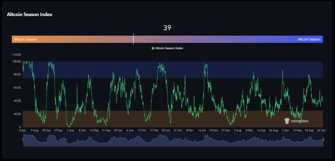 Altcoin Season Index is at 39, showing Bitcoin still leads the market🚨 Momentum stays limited until the index pushes above the 75 altseason zone.