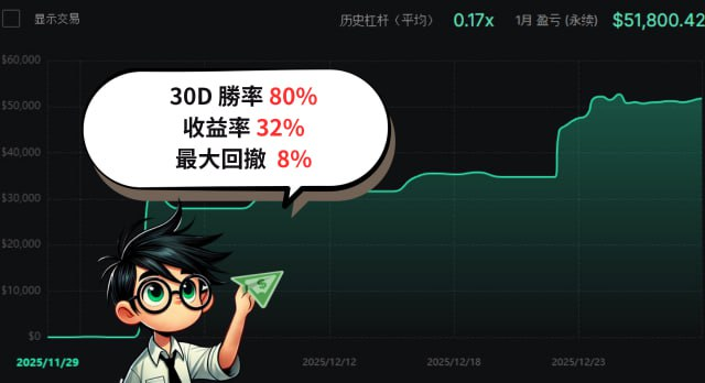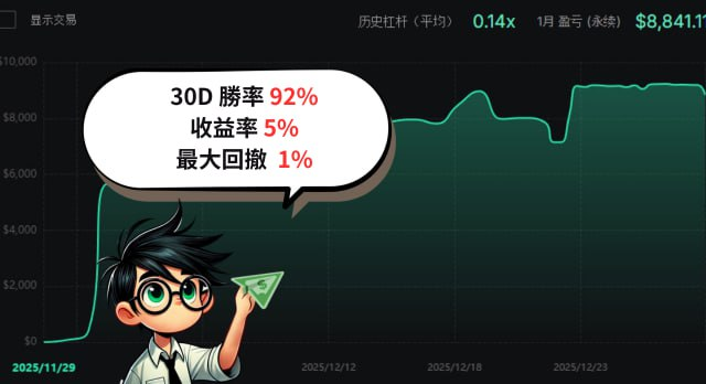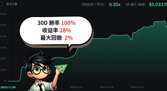 Hyperliquid Copy Trading Diary - 100% Win Rate Short-Term Hunter 0x6e652bb0144933dfce725074a9f6f4774c72dca9 This is the main trading style of a stable player who focuses on low-frequency trading and extreme risk control: 1️⃣ His precise short-term trading strategy involves holding positions for an average of 7 hours, which is considered low-frequency swing trading. He tends to enter short short when prices show short-term resistance or pullback signals, and quickly closes positions after making a profit to avoid overnight risk. 2️⃣Focus on short mainstream cryptocurrencies. The core profits come from short BTC and SOL, indicating that his strategy involves betting on the main downward trend of the market. He chooses mainstream assets with high liquidity and clear trends to ensure smooth entry and exit. 3️⃣ Extremely conservative money management With a 100% win rate over 30 days and a maximum drawdown of only 2%, it demonstrates strict stop-loss discipline. This is a strategy of "accumulating small wins into big wins," exchanging stable positive returns for extremely low risk exposure, and psychologically pursuing capital preservation rather than windfall profits. Trading advice: 1️⃣ The margin multiplier should not exceed 2.0 times. 2️⃣ Set a stop-loss order for 5% of your position and 10% of your account balance. Stable ⭐️⭐️⭐️ 30-day return: 28.24% 30-day retracement: 2% 30D Win Rate: 100% 30D Trading Count: 27 30-day average holding time: 7 hours, 42 minutes, 13 seconds