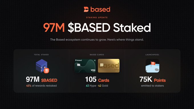 97M $BASED staked across all tiers. 63 Hype cards, 42 Gold cards issued. 75K Launchpool Points distributed. Nearly half of all staking rewards went straight back into the staking pools. Stakers earn Based VISA cards and Launchpool Points for upcoming partner projects, and they're choosing to compound rather than exit. That's the kind of community you can build on. Stay Based.