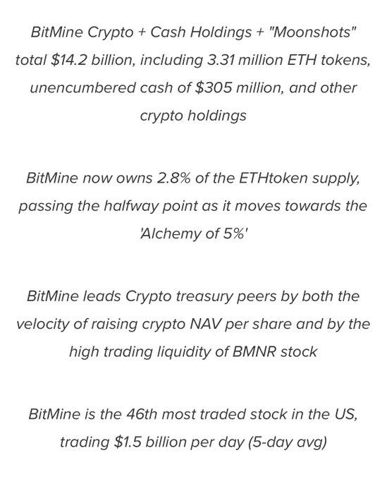 $BMNR reports holding 3,313,069 $ETH. Cash on hand: $305M Total $ETH purchased last week: 77,055 prnewswire.com/news-releases/b...…
