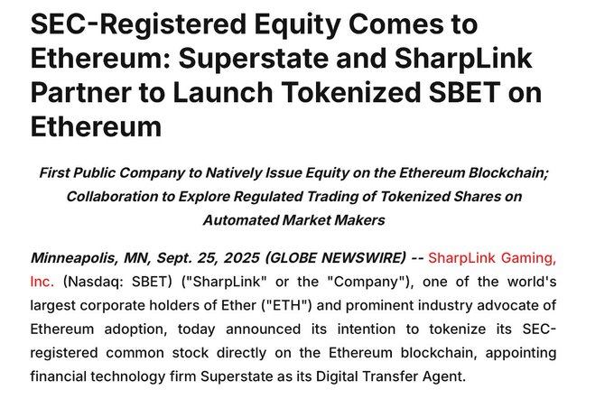$SBET and Superstate partner to launch tokenized $SBET on Ethereum investors.sharplink.com/press-...…