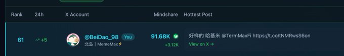 It has to be @MemeMax_Fi! They're still thinking about how to deal with this situation. They're even considering those of us who used to tweet regularly. But it's really a pity. Based on my previous ranking on MemeMax, if it ended, I'd basically be a 1-wu guaranteed win. Now it's all gone. We can only wait and see what MemeMax does next. Looking forward to their moves. twitter.com/BeiDao_98/status/2...