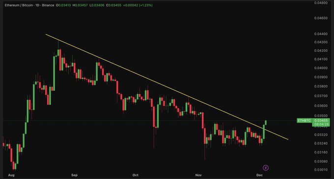ETH/BTC broke out of 3 month downtrend. This is ULTRA bullish for Altcoins.