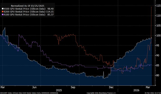 Normalized GPU rental price appreciation. AI compute prices are going up across the board, especially the newest installed Blackwell B200 chips followed by H100 and A100. AI demand is surging, showing no sign of slowing down. Credit: @Silicon_Data
