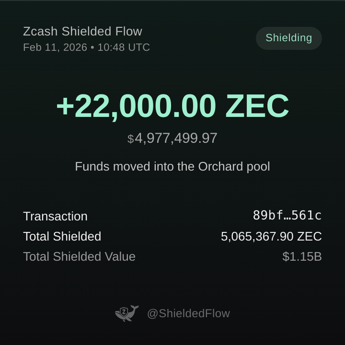 📈 A wallet just shielded 22,000.00 ZEC ($4,977,499.97) into the Orchard pool