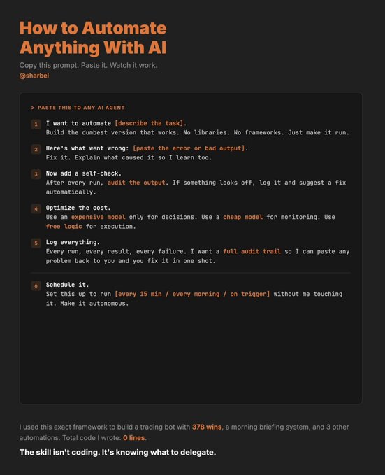 i used this exact framework to build a trading bot with 411 wins, a morning briefing system, and 3 other automations. total code i wrote: 0 lines.