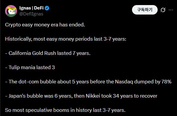 The era of making easy money in crypto is over. The era of making easy money in crypto is over. Historically, most periods of "easy money" lasted about 3 to 7 years. - The California Gold Rush lasted 7 years. - The Tulip Bubble lasted 3 years. - The Dot-com Bubble led to a 78% crash in the Nasdaq about 5 years later. - The Japanese Bubble lasted 6 years, and it took the Nikkei 34 years to recover. In other words, most speculative booms in history end within 3 to 7 years. The era of easy money in crypto began with ICOs in 2017. This was followed by DeFi Summer in 2020, NFTs in 2021, and then airdrops, point farming, and meme coins. It lasted for roughly 8 years. And I believe we have already passed that phase. This is because the Easy Money model has been fully discovered, utilized, and driven to the extreme through arbitrage amidst competition. The era of philosophical hard forks, such as BTC → BTC Gold and ETH → ETH Classic, has also ended. Crypto has now solidified not only technically but also culturally. - ICOs have faced regulation, - Airdrops are being farmed by industrial-scale civils, - Memecoin launches have degenerated from community play into extraction tools. This is why the Gold Rush analogy fits quite well. The end of FOMO is always similar. The visible gold veins are depleted, and from then on, industrial mining takes over. BTC mining was exactly the same. It shifted from individual mining to institutional-centric operations, and mining companies even went so far as to conduct IPOs. So, this is where crypto currently stands. It is a phase where people in suits like TradFi enter, and tokenization, RWA, enterprise permissioned chains, and regulation become central. The Trump family and insiders appear to be the ones raking in the last of the "easy money" in crypto. From a retail perspective, the days of picking up dropped gold nuggets are over. The remaining profit opportunities now lie in areas that require real infrastructure, real users, and real revenue. In other words, it means higher expertise, more specific knowledge, and truly grueling effort. I am not sure how many of us, who used to make money easily, are now ready to grind ourselves to the bone. I understand why many builders, KOLs, and projects are trying to milk every last drop out of crypto before leaving. After all, adapting to the new era of "hard money" won't be easy. So the question is this: Where should we pivot now to find that easy money? Asking on behalf of a friend. Original Text