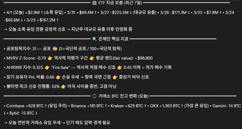⭐️ April 1st Bitcoin Trends, Minara AI Delivers It! Minara analyzes everything perfectly on its own just by entering the prompt correctly... I’ve set it up to send analysis results automatically every morning, and it’s quite convenient! —— 🔥 Today's Key Issues 🟢 Google Issues Quantum Computer Warning: Paper Released Claiming "BTC Private Key Can Be Deciphered in 9 Minutes with 5 Million Qubits" → Approximately 6.9 Million BTC Exposed to Potential Risk → Warning of Quantum Threats Becoming a Reality Before 2029 → Factors Contributing to Short-Term Psychological Downward Pressure 🐋 Major Whale Movements Today (Key Details) 🟢 Kraken → Coinbase 1,320 BTC ($89.7M) 🟢 Anonymous → Coinbase 760 BTC ($51.6M) 🟢 Anonymous → Coinbase 827 BTC ($56.2M) 🟢 Anonymous → Coinbase 774 BTC ($52.6M) 🟢 Coinbase → Jump Trading 885 BTC ($60M) 🟢 Binance → Anonymous 999 BTC ($67.1M) → Concentrated Inflow into Coinbase = Selling Pressure Alert → Jump Trading Accepted = Possibility of Institutional OTC Trading 📈 Today's Price Trend 🟢 Early Morning High $68,495 (17:00 UTC) / Morning Low $65,950 (09:00 UTC) / Current Price $67,904 🟢 Trend Summary: Early Morning in the $68,300 range → Morning Plunge to $65,950 → Afternoon Rebound → Attempting to recover to the $68,000 range 🟢 Key Support Level $65,800 ~ $66,200 🟢 Key Resistance Level $68,500 ~ $68,900 🏦 ETF Fund Flow (Last 7 Days) 🟢 4/1 (Today) +$2.9M ↑ (Slight Inflow) 🟢 3/31 +$69.4M ↑ • 3/27 -$225.5M ↓ (Large-scale) Leak) 🟢3/26 -$171.3M ↓ 🟢3/25 +$7.8M ↑ 🟢3/24 -$66.6M ↓ 🟢3/23 +$167.2M ↑ → Positive signal of shift to slight inflow today → Stabilizing following last week's massive outflow 🔍 Key On-Chain Indicators 🟢 Fear & Greed Index: 31 — Fear 😰 (0=Extreme Fear / 100=Extreme Greed) 🟢MVRV Z-Score: -0.70 👉 Historically undervalued zone 👉 Average band (fair value): ~$98,800 🟢AHR999 Index: 0.325 👉 "Fire Sale" — Buy signal at historical low 👉 Below 0.45 = Opportunity to buy at a low price 🟢 Long-term holders PnL Ratio: 0.66 👉 Losses Dominant → Approaching Surrender Phase 👉 Mid-to-Long Term Bottom Signal 🟢 Bull Market Peak Signal Progress: 33% 👉 Still Mid-Cycle, Not the Peak 💱 Exchange BTC Balance Changes (Today) 🟢 Coinbase +628 BTC ↑ (Caution: Inflow) • Binance +181 BTC ↑ • Kraken +629 BTC ↑ • OKX +1,363 BTC ↑ (Largest Inflow) • Gemini -14 BTC ↓ • Bybit -15 BTC ↓ → Overall Exchange Inflows Dominant Today → Caution Needed for Short-Term Selling Pressure 📅 Liquidation Heatmap (24h) 🟢 Downward Liquidation Concentration Zone: • $65,800 ~ $66,200 (Concentration of Long Liquidations) 🟢 Upward Liquidation Concentration Zone: • $68,600 ~ $68,900 (Short Liquidation Concentration) → Short squeeze surge possible upon breaking $68,900 → Caution advised for further decline if $65,800 is breached 🌍 Macro & Key News 🟢 Google publishes quantum computer paper → Warning of BTC/ETH crypto threat → Short-term sentimental antagonist, limited long-term impact 🟢 US benchmark interest rate maintained at 3.75% • Global M2 growth expanding at ~10.5% 🟢 US reciprocal tariff announcement scheduled for today (April 2) → Focus on risk on/off variables 🎯 Short-term Outlook 🟢 [Today ~ This Week] Expected to fluctuate within a range of $66,000 ~ $68,500 🟢 Scenario A (Upward) 🟢 Breakthrough of $68,900 → Short squeeze → Challenge for $70,000 🟢 Scenario B (Downward) 🔴 Breakthrough of $65,800 → $63,000~$64,000 Test 🟢[Mid-term 1~3 months] Recovery to $70,000 is the key turning point. Both MVRV and AHR999 maintain undervalued signals → Mid-point of a structural upcycle in progress. 😤 Today's Conclusion 🟢Short-term: Box range fluctuations, searching for direction 🟢Mid-term: Multiple on-chain undervaluation signals are valid 🟢Long-term Investors: Valid zone for split buying 🟢Short-term Traders: Enter after confirming a breakout above $68,900 🚨 Risk Management: Setting a stop-loss at $65,800 is recommended ※ This content is for investment reference only, and you are solely responsible for your own investment decisions.