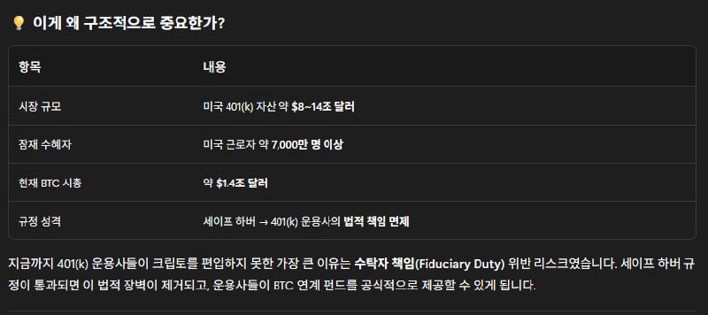 ⭐️ US 401(k) Retirement Plans Push to Allow Crypto — What Does This Mean for BTC? (Powered by Minara AI) The U.S. Department of Labor (DoL) has officially proposed Safe Harbor regulations to allow crypto in 401(k) retirement plans. SEC Chair Paul Atkins stated, "Now is the right time to open the $12.5 to $13.9 trillion retirement market to crypto," and BlackRock assessed this as a "massive advance." This is the result of an analysis of this issue using Minara AI's quality mode. —— 📌 Key Figures 🟢 US 401(k) Asset Size: Approx. $8–$14 trillion 🟢 Potential Beneficiary Workers: Over 70 million 🟢 Current BTC Market Cap: Approx. $1.4 trillion 💡 Why Is It Important? 🟢The biggest reason 401(k) managers have been unable to include crypto until now was the risk of violating fiduciary duty. 🟢Once the Safe Harbor regulations are passed, this legal barrier will be removed, 🟢and major managers like BlackRock and Fidelity will be able to officially offer BTC-linked products. 🔗 BTC Impact Flow 🟢 Regulation Proposal → Removal of Legal Barriers → Institutional Operator Participation → Passive Fund Inflow → Increased Structural Demand → Long-term Price Support for BTC 📊 Current On-Chain Signals 🟢 Fear & Greed Index: 28 (Extreme Fear) 🔴 🟢 AHR999 Index: 0.325 → Buying Zone at Historical Lows 🟢 🟢 Exchange BTC Balances: Continuously Decreasing (Accumulation Signal) 🟢 🟢 Bull Market Cycle Progress: Approx. 33% (Less than Midway) 🟡 📈 Comparative Case 🟢 Rise from $40K to $73K within 6 months following BTC Spot ETF approval in January 2024. Allowing 401(k) plans offers broader public accessibility than ETFs → Expecting greater structural demand in the long term. ⚠️ Risks 🟢 Currently in the proposal stage (not finalized) 🟢 Possible delays due to congressional backlash or legal objections 🟢 Short-term macro uncertainty (tariffs, geopolitical risks) exists —— 💬 Summary and Conclusion "While the market is currently dominated by fear, the structure is quietly changing." The acceptance of crypto in 401(k) plans could be a historic turning point, elevating BTC from 'digital gold' to a 'retirement asset.' ⚠️ This content is for informational purposes only and is not investment advice.