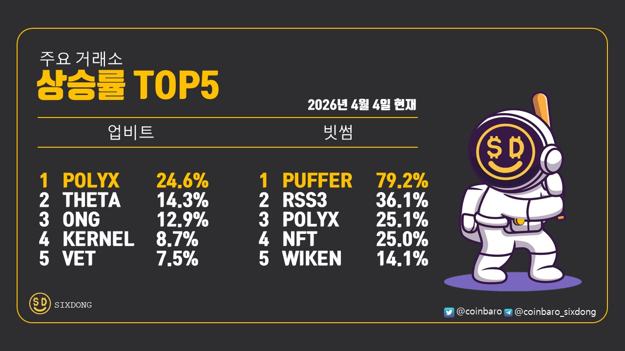 🔆 Top 5 Major Exchanges by Growth Rate Every Day at 5 PM Upbit: POLYX, THETA, ONG, KERNEL, VET Bithumb: PUFFER, RSS3, POLYX, NFT, WIKEN 🐸 wavis signal news 📣