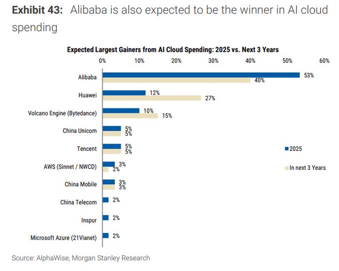 Morgan Stanley expects $BABA to capture 40% of China’s incremental AI cloud spending over the next 3 years. That’s more than Huawei, Bytedance, Tencent, and AWS China combined.