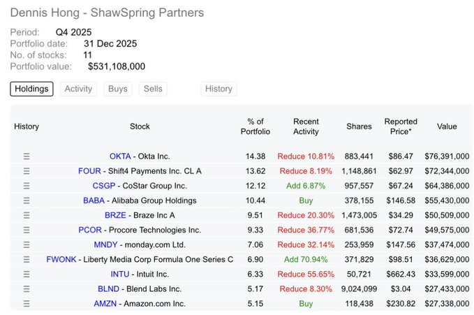 Dennis Hong of ShawSpring Partners adds $BABA as a top 4 position.