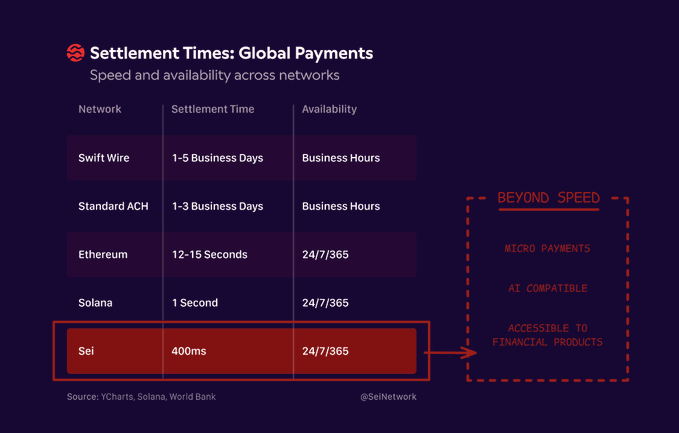 Not only speed, what is @SeiNetwork capable of when replacing the old fashion SWIFT payment rail? fyi, SWIFT stands for Society for Worldwide Interbank Financial Telecommunication, is born with the major use case of securing cross-border financial messaging for banks and institutions. imo, the cases of using SWIFT hints the possibilities: + large-volume transactions between aprox 11,500 institutions + cross-border transfer across over 200 territories + adopting emerging recent needs of digital trades, atomic payments and tokenizations Thus, if Sei (and upcoming Sei GIGA) should be handling all these use case much better, they may support even more use cases: + micro payments between platforms (including Web2 and Web3) leveraging x402 + automated payroll with AI-assisted features + accessible to common financial products Yet, when the settlement layer of Sei is able to go this far, it may become a much better version of SWIFT.