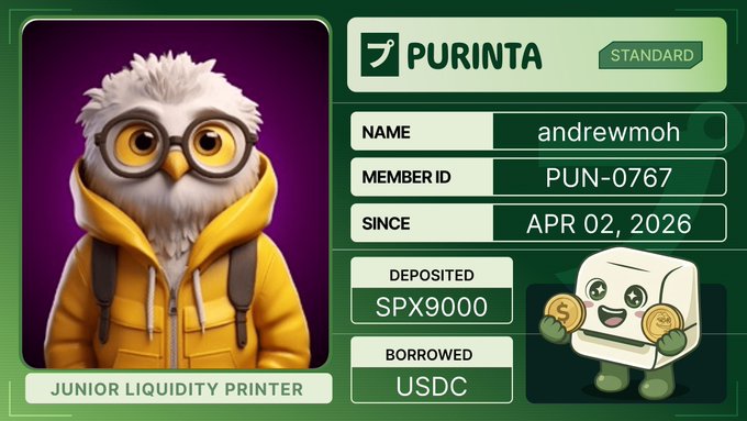 Be sure to have your name on the @purintaxyz Membership Card. This card reflects your identity on Purinta, and it grows as you stay active on Purinta. How to get one: + visit Purinta's Discord + head over to the Membership Card channel + mint your card There will be 3 tiers: Standard, Premium, and Omega. Higher tiers hint at more fun. And the good news is you can level up tiers through referrals. icymi, Purinta allows users to leverage memecoins for borrowing. Owning a membership card may unlock the liquidity gateway to your meme holdings. Don't underestimate your memes. twitter.com/andrewmoh/status/2...