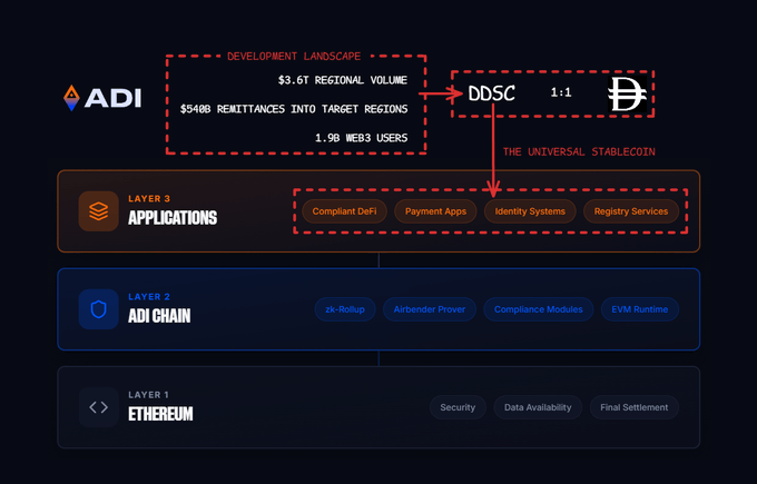As stablecoins are on the rise, @ADIChain_ also shows up with their stablecoin kicking off - DDSC. fyi, ADI Chain is known to be a hybrid L2/L3 combining shared liquidity L2 and highly customized compliance. According to their architecture, ADI Chain is best suited for RWAs and twitter.com/andrewmoh/status/2...