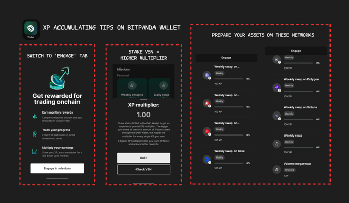 When the F&G was down, we knew it was time to grind for airdrops. And this time, shift your attention to @BitpandaWallet. Remember @vsntoken - the emerging web3 branch of Bitpanda? Engaging with the Bitpanda wallet app is the only gateway to access VSN airdrop. TBH, I feel unleashed when setting up a new Bitpanda wallet took me less than 30 sec. + PIN code instead of phrases + easy creation and funding + biometrics enabled right when creating the wallet Thus, there's no obstacle that prevents users from accumulating XP. Tips to max out XP: + try to maintain daily and weekly streaks + prepare your assets on Ethereum, Avalanche, OP, Base, Arbitrum, Polygon, and Solana (as many as you can) + increase your multiplier by staking VSN Just a reminder that you can send VSN from popular exchanges like Binance or OKX.
