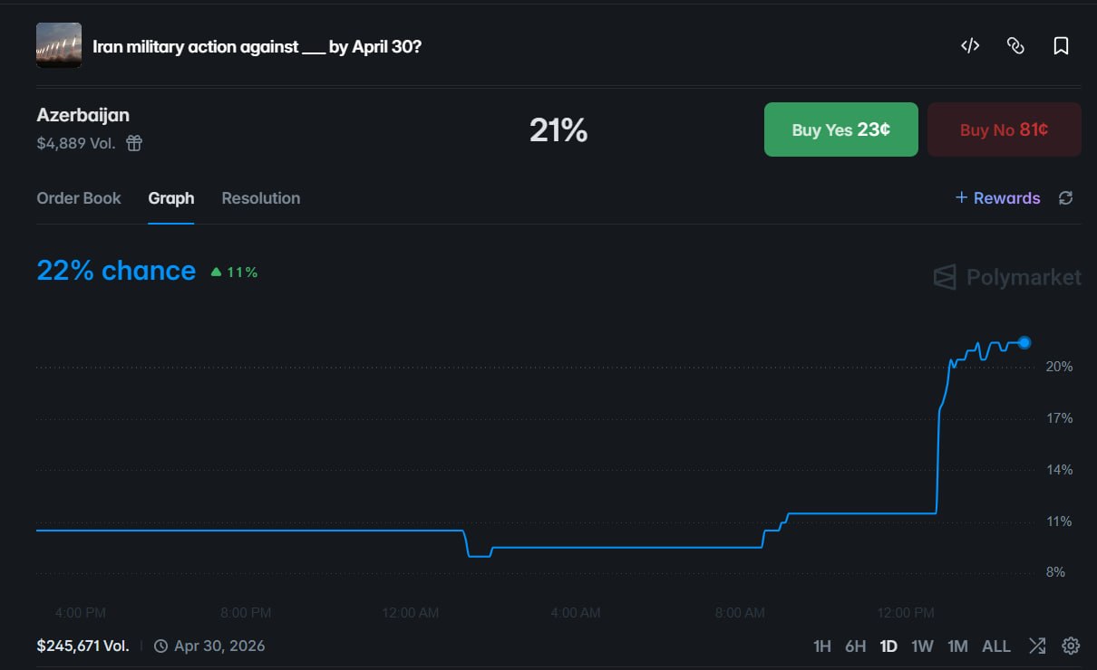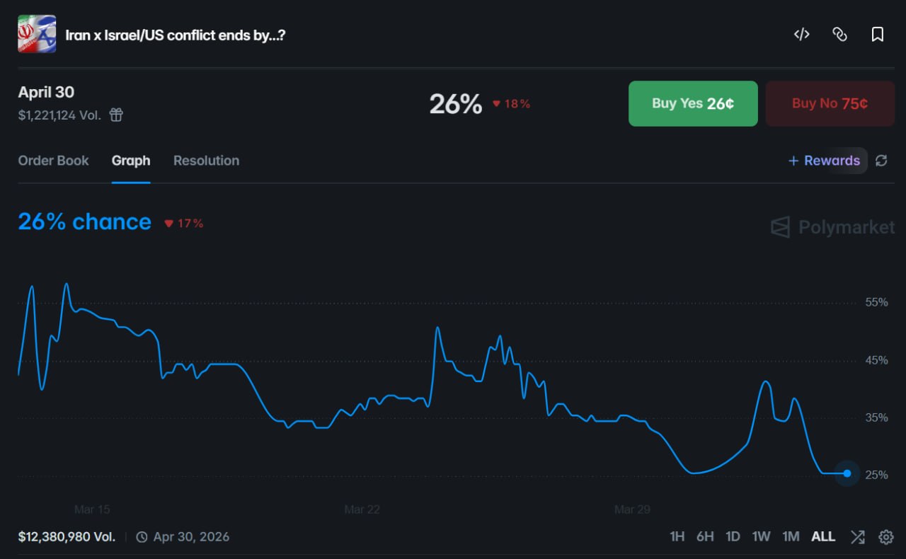 On the prediction market Polymarket, three smart money accounts have collectively invested $51,000, betting "yes" on the possibility that the conflict between Iran and Israel or the US will end by April. The current probability of "yes" is 26%.