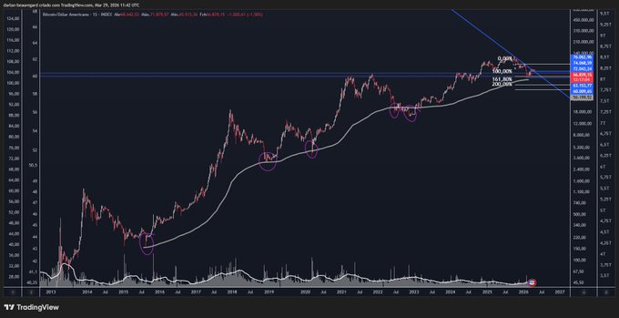 Interesting fact: This long-term support level has always marked the main cyclical bottom, FACT! Right now, it's hitting 56k, I'll buy at 50k too, using this metric as a guide, because it always gives that little spike. You can aim for at least 40k, but I can handle a 10k difference without getting depressed.