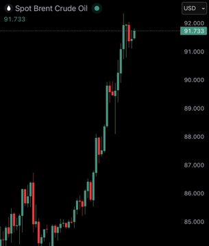 JUST IN: Brent crude oil price surges to $91, up 25% in the past 7 days.
