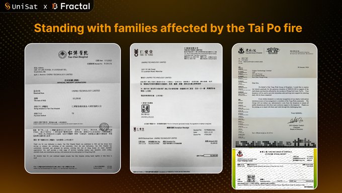 Final Update: Hong Kong Tai Po Fire Relief Donation The donation process has been completed. All 121,803.02 FB received in donations have now been burned on-chain. The equivalent value of HKD 408,000 was sent to three highly reputable charitable organizations, supporting recovery efforts for families affected: - Yan Chai Hospital: HKD 163,200 - Tung Wah Group of Hospitals: HKD 163,200 - Yan Oi Tong: HKD 81,600 Official receipts from each institution are attached below, documenting the donation amounts, dates, and recipients. All records are public and verifiable. All FB donations received were fully burned. 👉 Donation FB address & history: bc1qdqqra44tztjxfqdnccurlqstg70sxqte4s55rl 👉 Burn transaction: uniscan.cc/fractal/tx/ddbe96a5...… Background In late November 2025, a serious fire broke out in Tai Po, Hong Kong, causing significant loss and hardship for many families. To support the affected community, we together with @fractal_bitcoin jointly initiated an on-chain charitable donation. (Details: x.com/fractal_bitcoin/status/1...…) A total of 121,803.02 FB was raised: - 100,000 FB from Fractal and UniSat (50,000 FB each) - 10,901.51 FB donated by the community, including 10,155.18 FB from the @MoonCats__ community, thank you to every contributor - As committed, the UniSat team matched the full community donation of 10,901.51 FB (in HKD value) and included it in the same charitable donation. To ensure transparency and integrity, the full FB amount was burned on-chain before execution. We sincerely thank every community member who contributed and everyone who supported this effort. Your kindness shows that blockchain is not only about technology, but also about compassion and responsibility. We will continue to uphold transparency and accountability in our community efforts, and we wish all affected families strength and healing as they rebuild. 🌱🧡