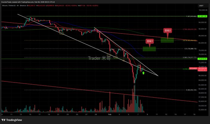 Hello everyone! I'm your go-to Bitcoin analyst, Mi Ge! Today is Sunday, so I'll take two minutes of your precious time to talk about this reversal pattern in BTC. 💡Yes, you heard right, BTC has reversed! Many of the reversal indicators in MiGe's analysis method have been marked with a ✅⬇️ ✅After a period of accelerated decline, the largest single-day rebound in recent times was achieved. ✅After a downward trend forms, specifically a white descending wedge, the price accelerates downward and breaks through the pattern, then rebounds sharply and returns to the pattern: this constitutes a false break. ✅The rebound exceeded the 23.6% Fibonacci retracement level. 🎯Let's talk about our goals: Target 1: 78-80k, this is the Fibonacci retracement level, which is also the location of the middle Bollinger Band on the daily chart. Target 2: 83.5k or 88-89k, depending on the strength of the move. The 61.8% Fibonacci retracement level here is also the upper edge of the linear channel that has formed on the 126k chart. Mid-term target 1: 105-110k, the upper limit of the large-scale oscillation range. Mid-term target 2: 126-133k, a high-liquidity zone above the previous high. 🔥Summary: I buy the dips spot and long contracts below 65k, and I am strongly bullish. Here, I would like to wish everyone good health and all the best. The children are on holiday, and I also wish all parents and children a wonderful holiday. —Love you all, MiGe❤️ twitter.com/tradermige/status/...