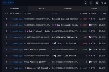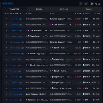 Ba địa chỉ, nghi ngờ thuộc về cùng một cá voi/thực thể, đã rút tài sản từ Lido/Eigenlayer và đổi lấy ETH trong bốn giờ qua. Sau đó, họ đã chuyển 7653 ETH, trị giá 21,62 triệu đô la, đến cùng một địa chỉ gửi tiền trên Binance . Số ETH này được tích lũy từ tháng 5 năm 2023 đến tháng 7 năm 2025 với giá trung bình là 2476 đô la. Bán số ETH này sẽ mang lại lợi nhuận 2,668 triệu đô la, nhưng con số này thấp hơn gần 69% so với mức lợi nhuận cao nhất.
