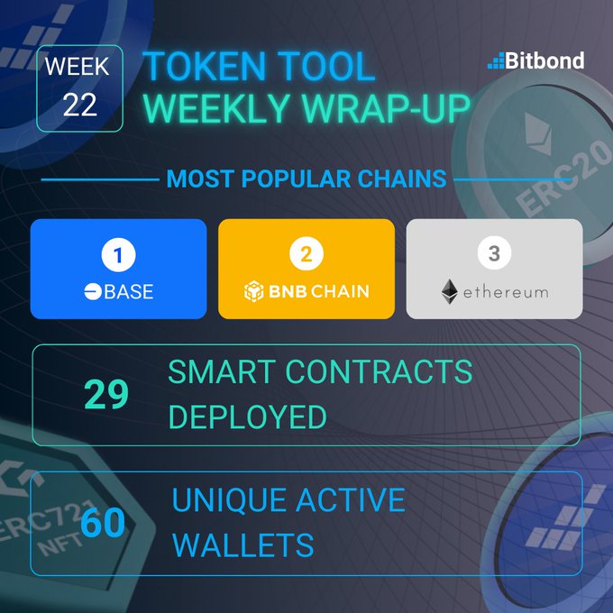 Token Tool Weekly Wrap Up Last week saw 29 contracts deployed across all supported networks, with @base 🥇, @BNBCHAIN 🥈and @ethereum 🥉 being the most popular. 60 unique active wallets interacted with #TokenTool. Was your project deployed using Token Tool? Let us know 👇
