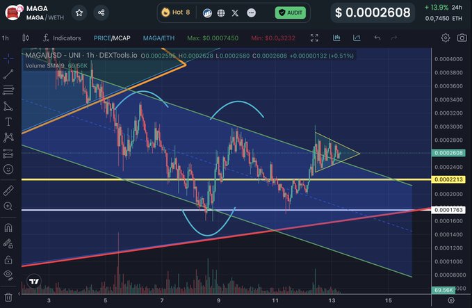 UPDATE: ZOOMED IN $MAGA was able to break out of the descending channel for a bit and is now forming a bullish pennant. (yellow) Keep in mind broader crypto market is pulling back a bit. But if #BTC & $ETH start to rip, $MAGA is going to MOON SHOT ! 🚀📈🇺🇸 NFA|DYOR