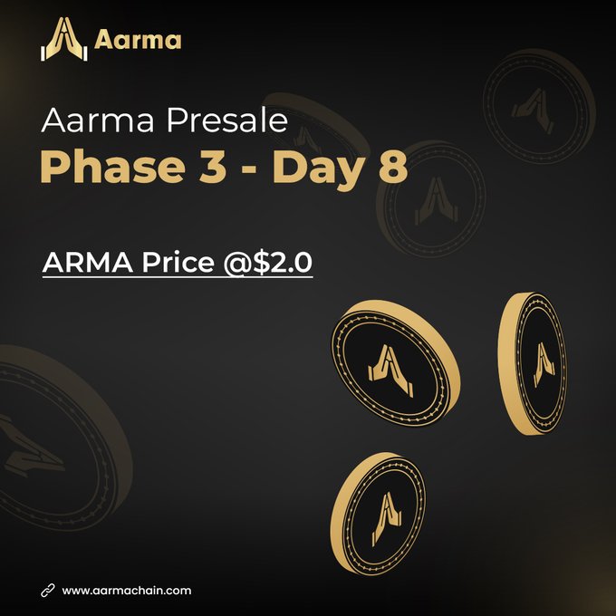 PRESALE - PHASE 3 IS LIVE! Purchase ARMA Coin @$2.0 ✅ To remind you, ARMA price increases with every new phase! Buy ARMA at a discounted price before this phase ends! Buy now: presale.aarmachain.com #AarmaChain #ARMA #Aarma #Presale #Crypto #Cryptocurrency #Blockchain