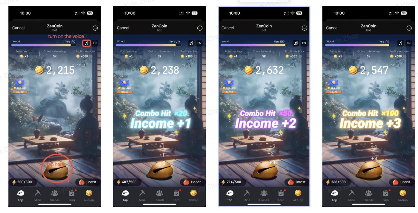 Regular taps earn 1 ZenCoin each time, while fast consecutive taps can yield extra time-limited bonuses as shown below.