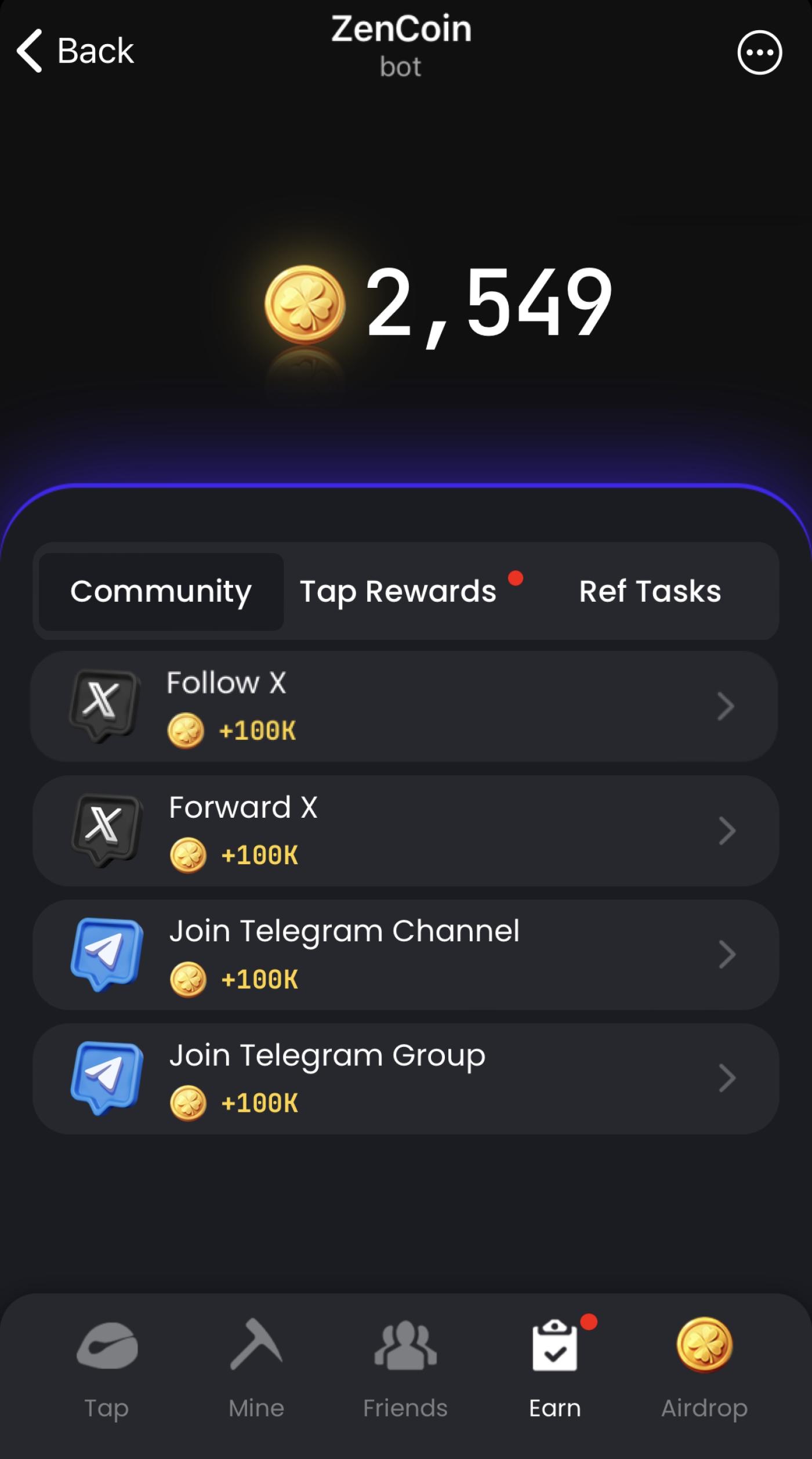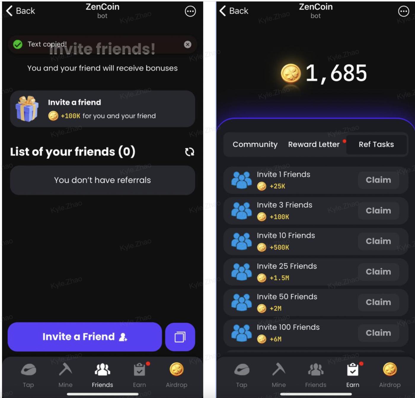 - Inviting Friends: Share your unique invite link. Successful invites reward both parties with 100K ZenCoins and users can claim certain quantities of ZenCoins on [Ref Tasks].