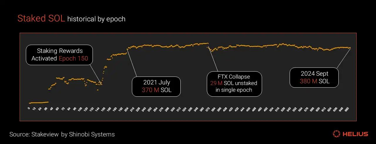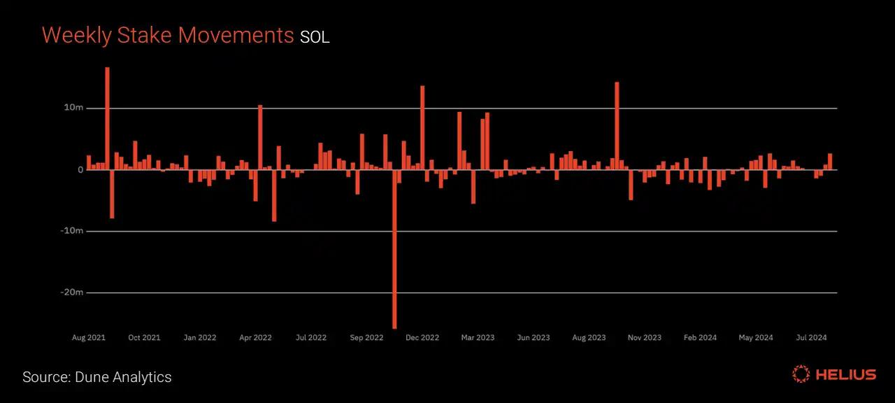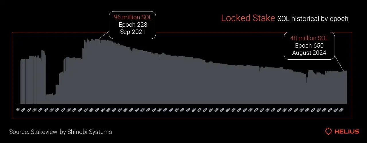Over the past three years, Solana's locked stake unlocking rate has been relatively stable, falling from a peak of 96 million SOL in September 2021 to 48 million SOL in September 2024, an overall reduction of 50%.