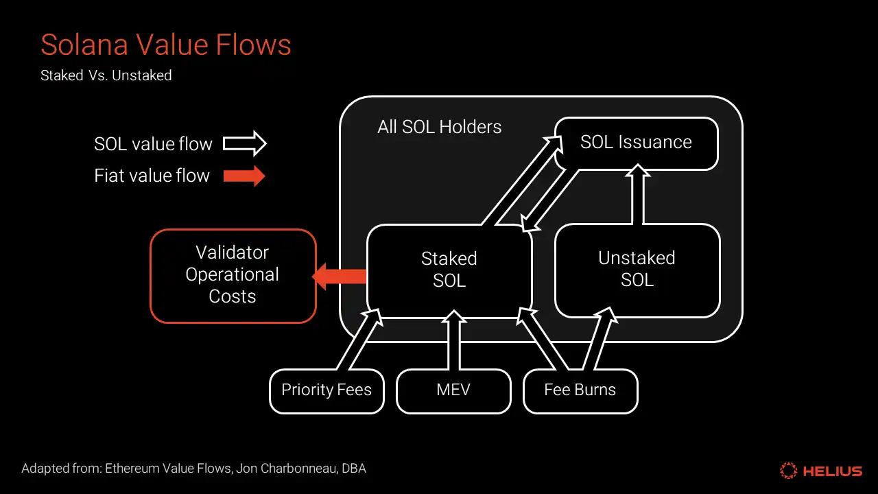 This model shows how Proof of Stake (PoS) staking not only prevents dilution, but actually strengthens holders’ network ownership over time. Additionally, this simplified scenario accurately reflects Solana’s current inflation rewards. With Solana’s current inflation rate of 5.07% and a total supply of 583 million SOL, of which 378 million SOL are staked (a staking rate of 65%), users can expect similar annual value transfers through inflation rewards. Stakers gain approximately 2.4% in network ownership, while non-stakers lose approximately 4.8% in network ownership. Based on this simplified model, stakers should receive a nominal 7.5% SOL staking return per year, which is roughly in line with current actual returns. Of course, the actual situation is more complicated than this model, which we will discuss in detail in the subsequent discussion.
