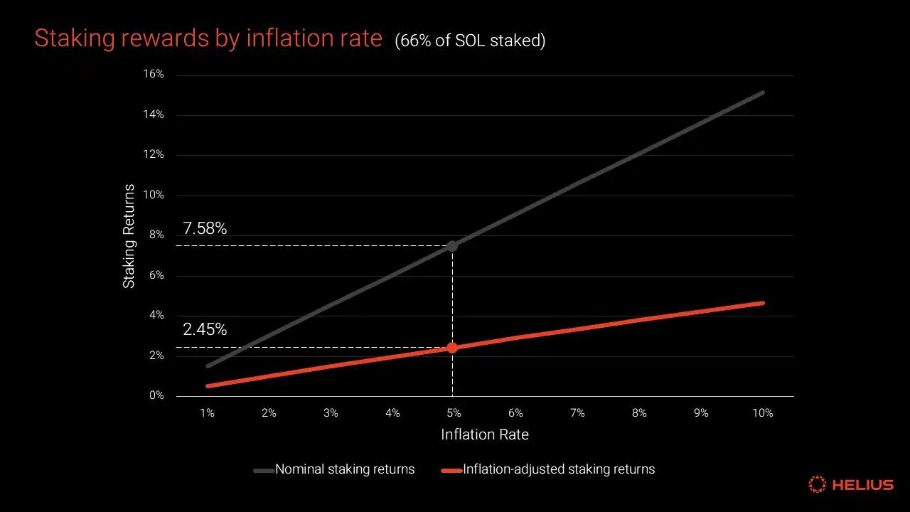 Nominal and inflation-adjusted staking rewards assuming a constant SOL staking rate of 66%
