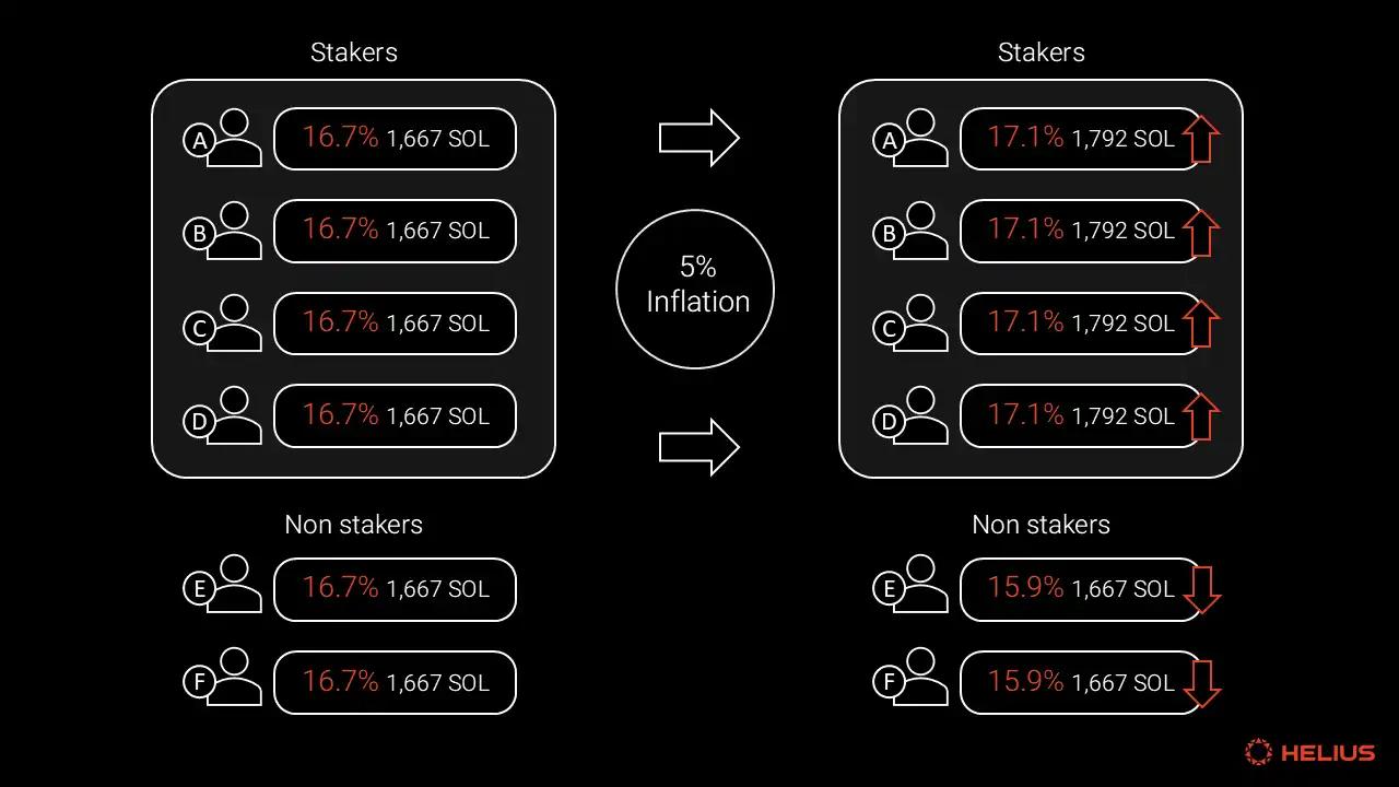 Initially, each user holds 1,667 SOL tokens, representing 16.7% of the network share and a market cap of $166,666. Within a year, 500 new tokens will be distributed to stakers as inflation rewards. After a year, the four stakers will each have 1,792 SOL tokens, a nominal increase of 125 tokens (7.5%), and their network share has increased by 0.4% to 17.1%. Meanwhile, the two non-stakers have the same number of tokens and their network share has decreased by 0.8% to 15.9%. Assuming the total market cap of the network remains unchanged at $1 million, the value of each SOL will decrease from $100 to $95.23. However, the total value of each staker's network share will increase by $3,968 (an increase of 2.4%). Correspondingly, the value of each non-staker's token will decrease by $7,936 (a decrease of 4.8%).