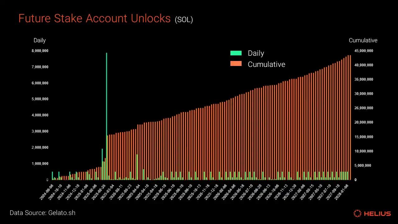At least 43.5 million SOL tokens remain locked in staking accounts, representing 7.5% of the current supply. This includes 41 million SOL tokens sold to large industry entities such as Galaxy Digital and Pantera during the FTX Asset bankruptcy proceedings earlier this year. Some companies, such as Neptune Digital Assets, have publicly announced the details of their purchases - Neptune purchased 26,964 SOL at $64 per coin. 20% of these tokens will be unlocked in March 2025, and the remainder will be unlocked linearly every month until early 2028. This unlocking schedule is consistent with the on-chain locked staking account data (see chart).