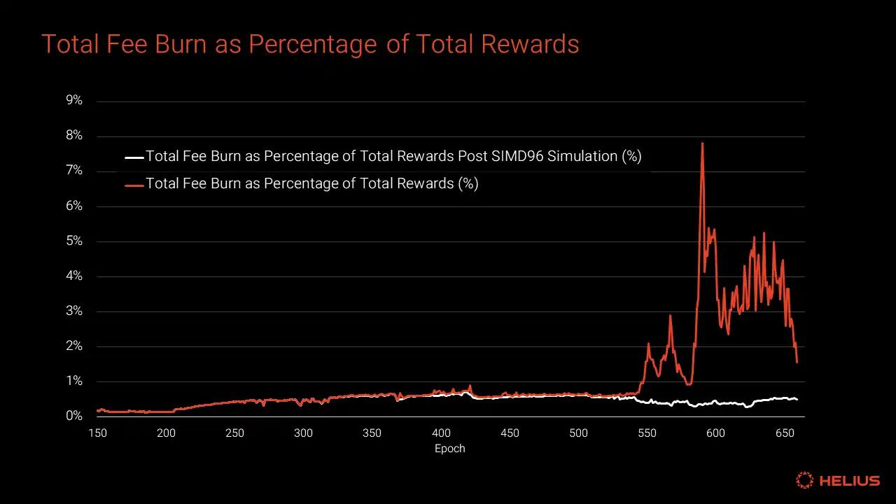 In Epoch 546, which began on December 14, 2023, fee burns accounted for more than 1% of total staking rewards for the first time, and reached a peak of 7.8% in Epoch 590, which began on March 18, 2024. Over the last 100 epochs, fee burns have averaged 3.2% of total staking rewards. However, if we apply the SIMD-96 rule changes (removing priority fee burns) to simulate fee burns, the total amount burned will never exceed 1% of total staking rewards at any point in Solana's history. If the SIMD-96 changes were implemented over the last 100 epochs, total issuance would increase by 2.81% (for example, an epoch with 5% net inflation would rise to 5.14%). Previously, validator community members estimated that this increase in total issuance could be slightly higher, at 4.6%.
