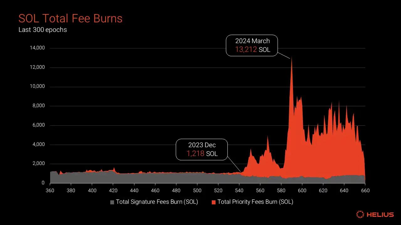 Starting from Epoch 544 on December 10, 2023, there is a clear turning point in priority fees. The highest total fee burn occurred in Epoch 590 (starting on March 18, 2024), with a total of 13,212.31 SOL burned. In the last 100 epochs, the average total fee burn per epoch is 5,372.16 SOL.