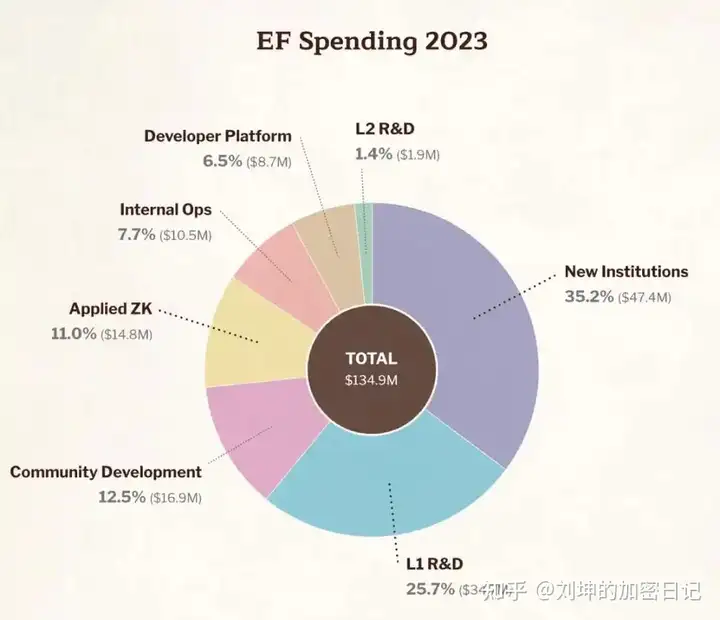 3. The Ethereum Foundation plans to spend $134.9 million in 2023, an increase of nearly 28% compared to 2022, with spending on new institutions or organizations reaching $47.4 million (35.2%), and L1 research and development accounting for 25.7%;