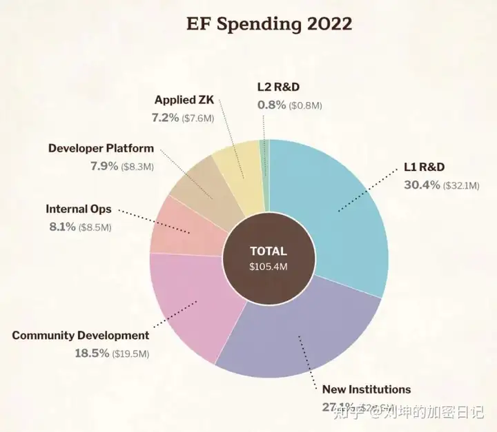 2. The Ethereum Foundation spent a total of $105.4 million in 2022, with the most spent on L1 research and development at 30.4% ($32.1 million), followed by new institutions or organizations at 27.1% ($28.6 million);