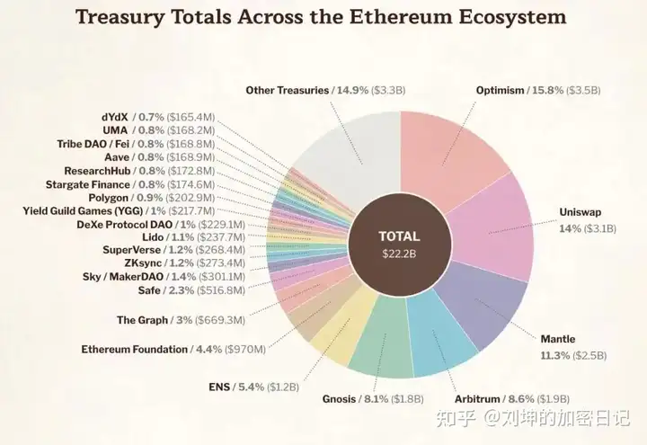The image below shows the total value of the treasuries held by projects within the Ethereum ecosystem, reaching $22.2 billion, including both the liquid funds and the yet-to-be-released funds of these projects. Most project treasuries are primarily composed of the project's native tokens. These treasury funds will provide support for the development and maintenance of the Ethereum ecosystem.