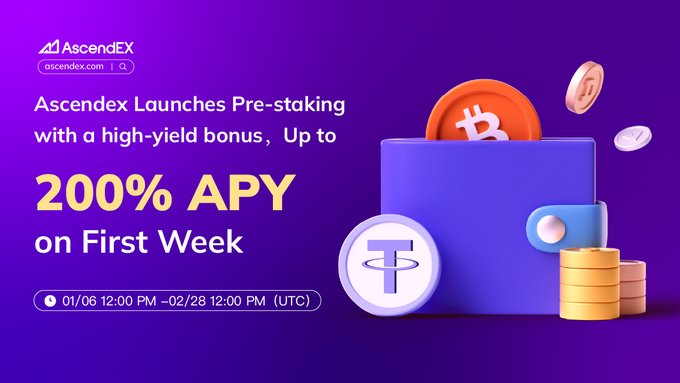 🚀 AscendEX Pre-Staking: Unlock Huge Yields & Boost Your Crypto Portfolio! 🚀 💸 Earn up to 200% APY in the First Week by staking your BTC, ETH, or USDT! It’s never been this easy to grow your crypto wealth! 🔥 📅 Event Period: ⏳ 2025/01/06 12:00 PM - 2025/02/28 12:00 PM (UTC)
