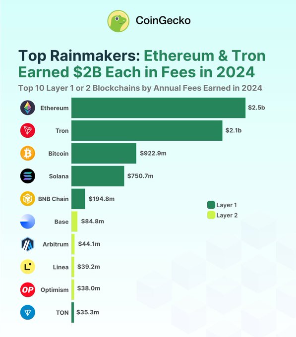 #ChartoftheDay According to @coingecko, #Ethereum ranks as the top1 rainmaker with $2.48 billion in fees. Ironically, the Ethereum Foundation (EF) has had to sell 4,466 ETH to "fill" its fund gap, at an average price of only $2,823. Criticism of the EF has been ongoing, as the