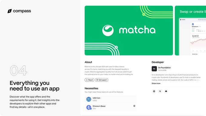 4/ Just like on any other App Store, app pages on Compass have all the info you need to understand if an app is compatible with your current wallet or setup. Documentation, developer details, and dependencies are just a tap away.